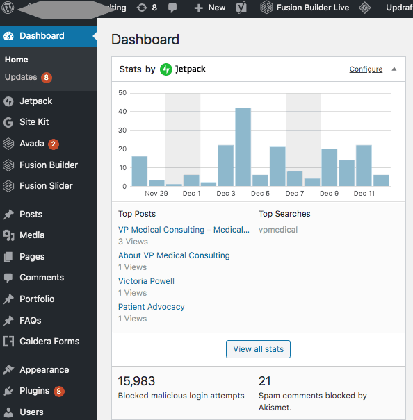 Very simple illustration above of a typical WordPress installation on a website. As you can see in the illustration it indicates that there are 8 updates waiting to be performed. Since this is a client site that our agency services, these have already been updated. However, it is not uncommon for me to log into a church website that has requested my help, only to find that updates have not been formed for months and even sometimes years.